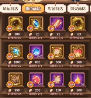 职位商店根据自身的职位等级开启新道具,女神泪和神陨是最值得购买的!其他道具选择购买!