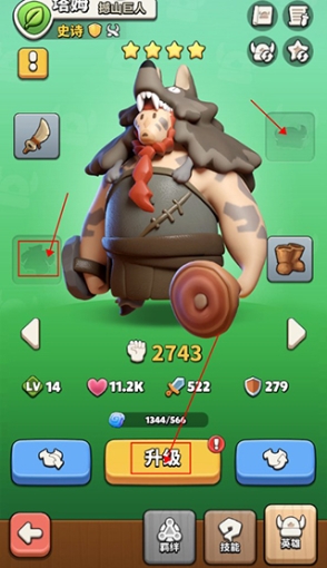 玩家在军营页点击英雄,即可开始给英雄升级,还能给英雄装上强力装备。