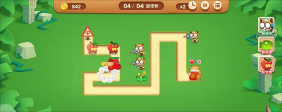 1、在战斗界面每次消灭一个怪物都会获得一些金币,在游戏上方中间的位置上会显示一共有几波怪物,比如04/04代表本关游戏一共4波怪物现在已经出现了4波怪物