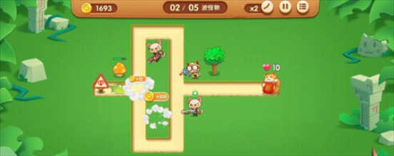 自由路径关卡:没有固定的路径,怪物可以在场景中自由寻路,在地图中放置猫咪可以阻挡怪物前进。