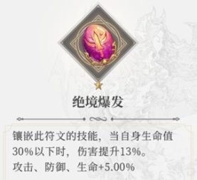 绝境爆发符文:橙色符文,这个一看就知道是专为狂战队设计的符文,其他阵容都难以在低血量打出奇效。所以应用起来也以狂战角色镶嵌为主。
