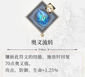 奥义流转符文:蓝色符文,作用是镶嵌该符文的技能,释放时回复XX点奥义值。玩过泰雷这个角色的玩家都知道,泰雷的大招是需要消耗2格奥义(2000点奥义值),所以需要先锋位帮助泰雷积攒奥义,在先锋位伤害较低时,往往一套技能后攒不足2格奥义(算上换人后泰雷前三个技能能恢复的奥义值),会让泰雷上场时打不出奥义,则此种符文镶嵌在先锋技能上,既不会因为输出低浪费进攻性符石的效果,还可以完成辅助后续角色爆发的作用。