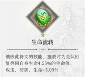 生命流转符文:橙色符文,作用是镶嵌此符文的技能,施放时为全队回复等同伤害XX%的生命值。这个符文目前也没有什么特别合适的使用场景,还有待进一步开发,新手同样先跳过不考虑。