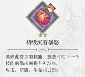 沉着暴怒符文:初级是紫色品质,中级是橙色,但效果一样,都是提升下一个技能的暴击几率。符文的重点效果还是在能够为后一个技能增加比较高的暴击率。那么以勇士队的核心输出精灵公主葛莱蒂丝(自动技能释放顺序为3-2-1-1-1-奥义)为例,其本身就是一个享受勇士阵容暴击伤害暴击率加成的角色,那么我们将这个符文镶嵌在1技能上,不但能享受多次1技能加暴击的效果,自动战斗时大招也仍然能够享受加成。
