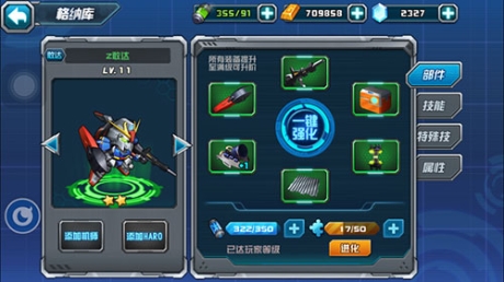 技能:超级光速军刀(初始技)、6连装榴弹发射器(机体升级至绿色后解锁)、能量提升(机体升级至蓝色后解锁)、能力提升(机体升级至紫色后解锁)
