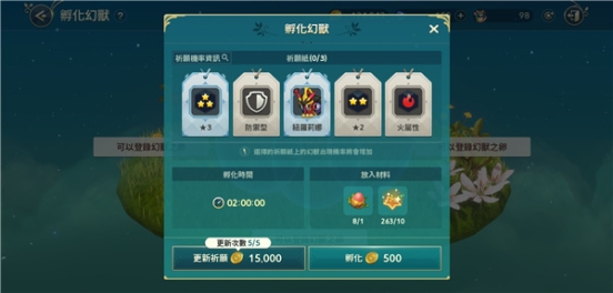 这游戏的另一大卖点就是「幻兽」了,你可以把他当作其他游戏内的宠物,但他同时也是你并肩作战的好伙伴,甚至每只幻兽都有自己PVP的专属技能,其重要性可见一班。而幻兽在游戏内也是可以免费获取的,透过幻兽孵化内祈愿的选项更有机率获得四星的幻兽,只是要注意一点,当你在孵化选项内没有你想要的幻兽名单时,就直接孵化或最多刷新一次就好,以免造成金币和梦之碎片的浪费。