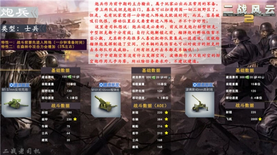 1、炮兵在中前期可谓是中流砥柱的作用,反坦克炮和榴弹炮更是属于必出军备,但是它龟爬一样的速度、1分钟的进入阵地时间等设定被很多玩家诟病,相比这样的“缺点”,在森林中所增加的攻击力显得过于微小。