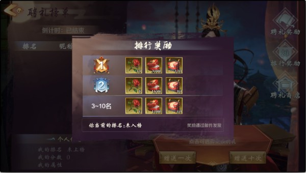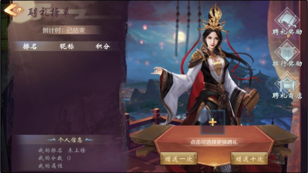 2、积分达到要求可获得聘礼奖励,活动结束根据玩家聘礼积分排名发放奖励;